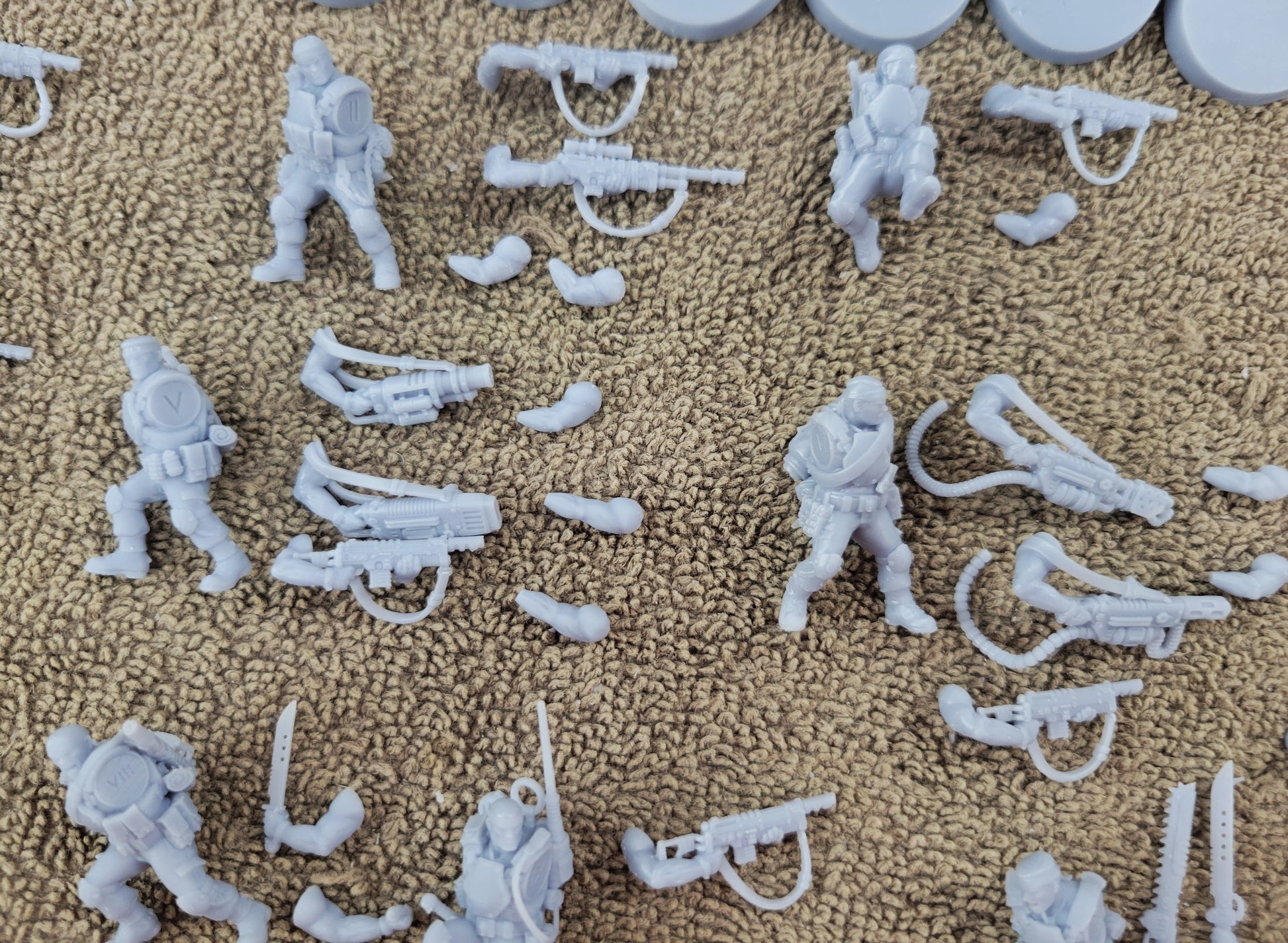 The full kit includes 10 distinct poses and 25mm bases. Each model is marked with roman numerals for assembly assistance.