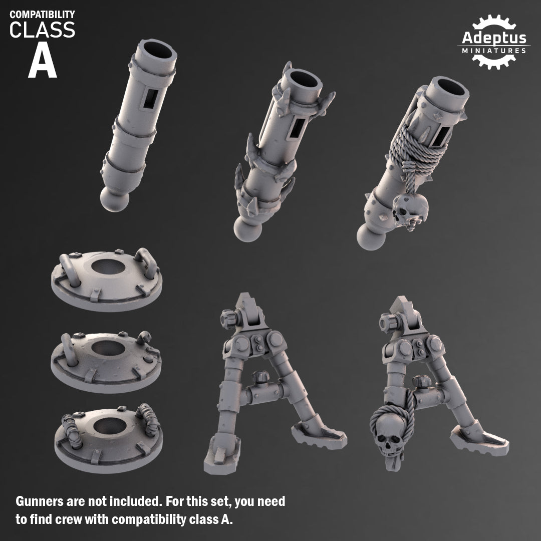 3 Gunners with Mortars- each model includes mortar, stand, rear part, 3 ammos, ammo box (2 parts), 1 loose lasgun (3 total)